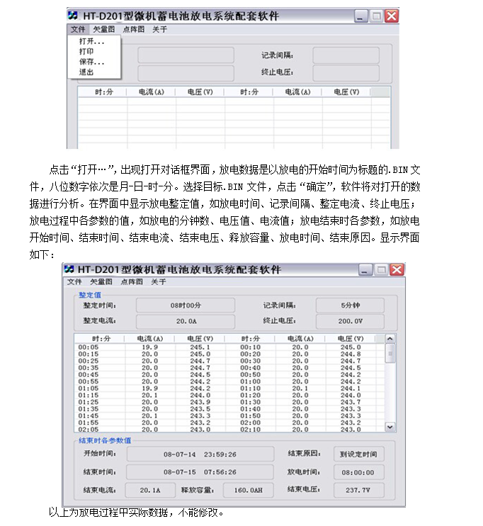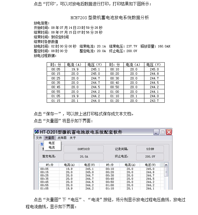 5.5 記錄放電過程的電流電壓值(每5分鐘一筆),供事后分析查閱。放電數(shù)據(jù)可通過U盤上傳至電腦,使用配套軟件對(duì)其進(jìn)行全面分析,數(shù)據(jù)可以以報(bào)表、圖形等形式顯示,并可通過打印機(jī)打印數(shù)據(jù)及圖形,方便用戶查閱和整理。